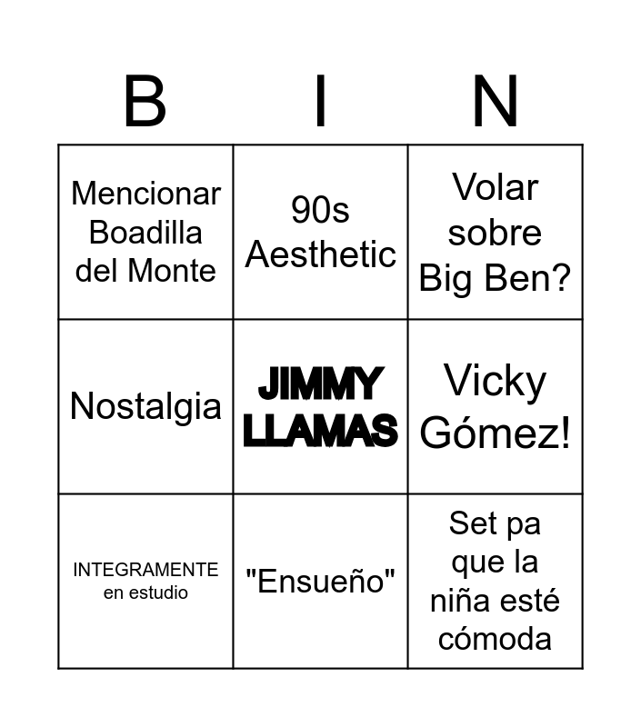 This bingo card has a free space and 8 words: Vicky Gómez!, Volar sobre Big Ben?, 90s Aesthetic, INTEGRAMENTE en estudio, Mencionar Boadilla del Monte, Set pa que la niña esté cómoda, Nostalgia and "Ensueño".