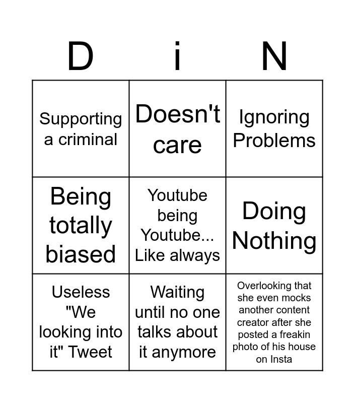 This bingo card has a free space and 8 words: Doing Nothing, Ignoring Problems, Doesn't care, Useless "We looking into it" Tweet, Supporting a criminal, Overlooking that she even mocks another content creator after she posted a freakin photo of his house on Insta, Being totally biased and Waiting until no one talks about it anymore.