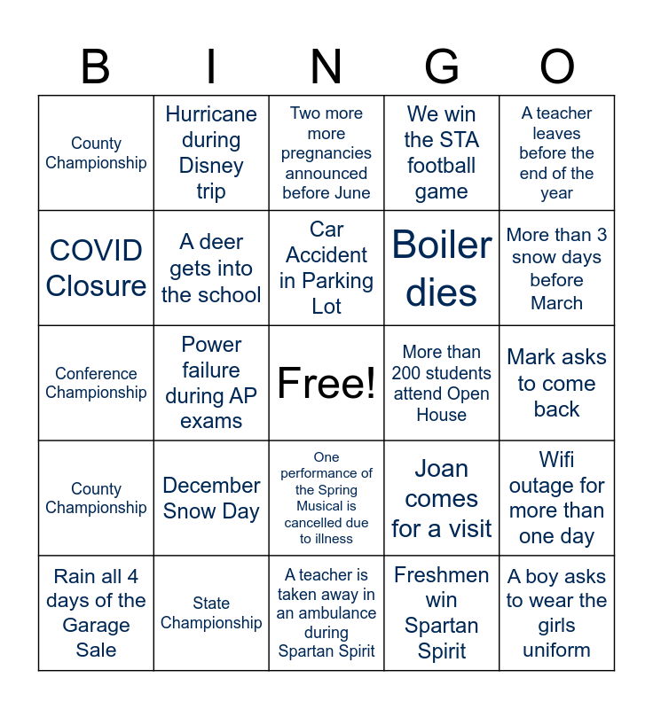 This bingo card has a free space and 24 words: December Snow Day, State Championship, Car Accident in Parking Lot, Rain all 4 days of the Garage Sale, A teacher leaves before the end of the year, County Championship, COVID Closure, Hurricane during Disney trip, More than 200 students attend Open House, One performance of the Spring Musical is cancelled due to illness, Boiler dies, Conference Championship, Joan comes for a visit, Wifi outage for more than one day, A deer gets into the school, Freshmen win Spartan Spirit, Mark asks to come back, Two more more pregnancies announced before June, More than 3 snow days before March, Power failure during AP exams, A boy asks to wear the girls uniform, County Championship, We win the STA football game and A teacher is taken away in an ambulance during Spartan Spirit.