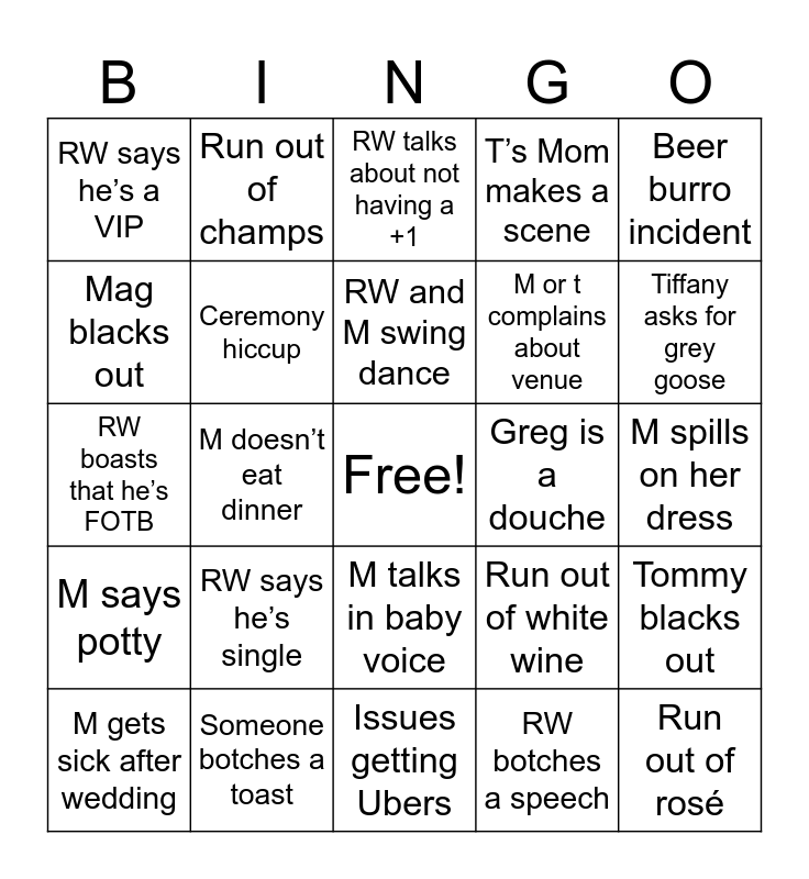 This bingo card has a free space and 24 words: M gets sick after wedding, RW says he’s single, RW and M swing dance, RW botches a speech, Beer burro incident, RW says he’s a VIP, Run out of champs, RW talks about not having a +1, Greg is a douche, M spills on her dress, RW boasts that he’s FOTB, Ceremony hiccup, Run out of white wine, Tommy blacks out, Mag blacks out, Someone botches a toast, Issues getting Ubers, T’s Mom makes a scene, Tiffany asks for grey goose, M says potty, M doesn’t eat dinner, M talks in baby voice, M or t complains about venue and Run out of rosé.