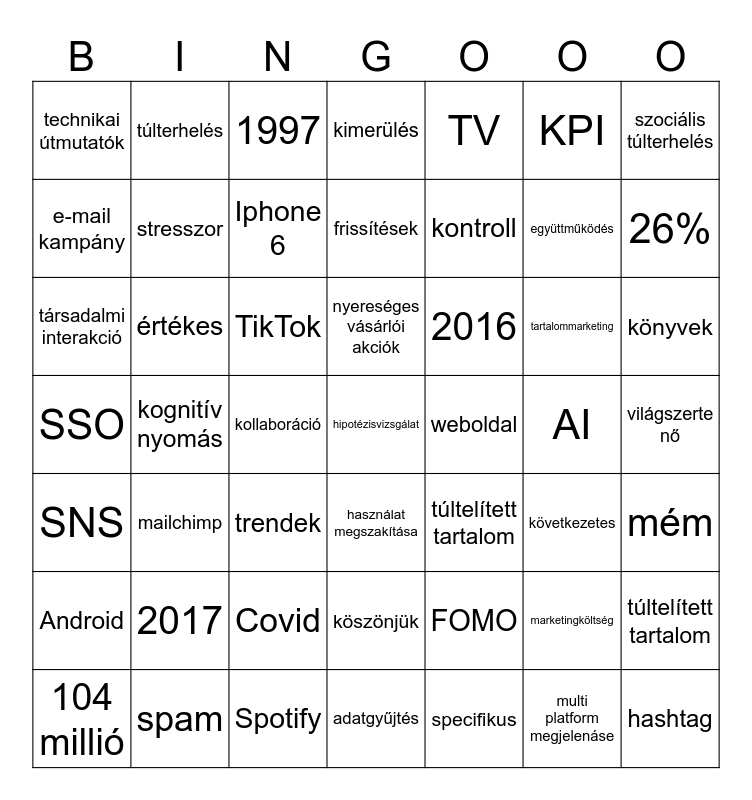 This bingo card has 49 words: Android, értékes, Covid, használat megszakítása, 2016, AI, szociális túlterhelés, 104 millió, stresszor, kollaboráció, frissítések, TV, együttműködés, könyvek, SNS, mailchimp, 1997, nyereséges vásárlói akciók, specifikus, KPI, 26%, e-mail kampány, túlterhelés, Iphone 6, adatgyűjtés, kontroll, tartalommarketing, túltelített tartalom, technikai útmutatók, kognitív nyomás, Spotify, köszönjük, túltelített tartalom, marketingköltség, világszerte nő, SSO, 2017, trendek, hipotézisvizsgálat, weboldal, multi platform megjelenáse, mém, társadalmi interakció, spam, TikTok, kimerülés, FOMO, következetes and hashtag.