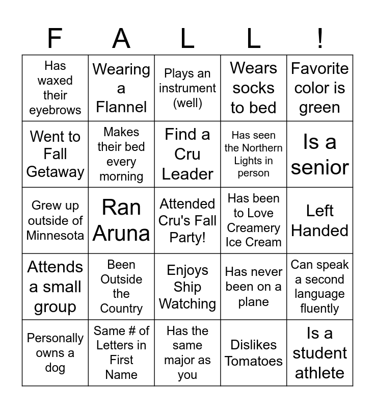 This bingo card has a free space and 24 words: Been Outside the Country, Same # of Letters in First Name, Find a Cru Leader, Personally owns a dog, Favorite color is green, Has waxed their eyebrows, Went to Fall Getaway, Wearing a Flannel, Has been to Love Creamery Ice Cream, Enjoys Ship Watching, Has seen the Northern Lights in person, Grew up outside of Minnesota, Has never been on a plane, Can speak a second language fluently, Makes their bed every morning, Dislikes Tomatoes, Left Handed, Plays an instrument (well), Is a senior, Ran Aruna, Is a student athlete, Attends a small group, Wears socks to bed and Has the same major as you.