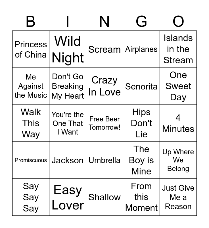 This bingo card has a free space and 41 words: Smooth, Walk This Way, Ain't No Mountain High Enough, Don't Go Breaking My Heart, Easy Lover, Umbrella, Crazy In Love, I Got You Babe, Islands in the Stream, Promiscuous, You're the One That I Want, Airplanes, Just Give Me a Reason, 4 Minutes, Hips Don't Lie, Jackson, Empire State of Mind, Princess of China, Whatta Man, Scream, Up Where We Belong, Dilemma, Shallow, Senorita, Moves Like Jagger, Stan, From this Moment, It's Your Love, One Sweet Day, Stay, If I Never See You Again, Wild Night, Say Say Say, Stop Draggin' My Heart Around, The Boy is Mine, Me Against the Music, Rain on Me, American Boy, Endless Love, Telephone and Let Me Blow Ya Mind.