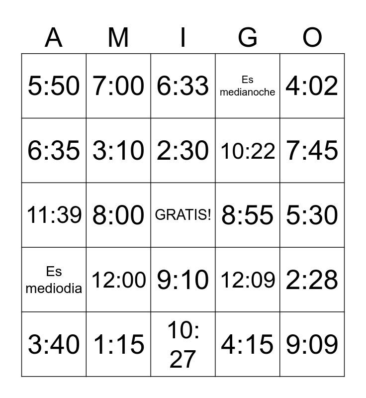 This bingo card has a free space and 24 words: 12:00, 1:15, 2:30, 3:40, 4:02, 5:50, 6:35, 7:00, 8:55, 9:10, 10:22, 11:39, 12:09, 2:28, 3:10, 4:15, 5:30, 6:33, 7:45, 8:00, 9:09, Es mediodia, Es medianoche and 10: 27.