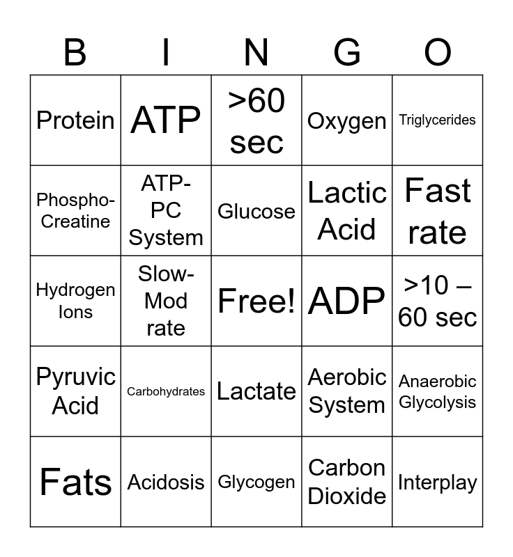 This bingo card has a free space and 25 words: Carbohydrates, Glycogen, Glucose, Fats, Triglycerides, Protein, Phospho-Creatine, ATP, ADP, Lactate, Lactic Acid, Hydrogen Ions, Aerobic System, Anaerobic Glycolysis, ATP-PC System, 0-10 sec, >10 – 60 sec, >60 sec, Fast rate, Slow-Mod rate, Interplay, Acidosis, Pyruvic Acid, Oxygen and Carbon Dioxide.