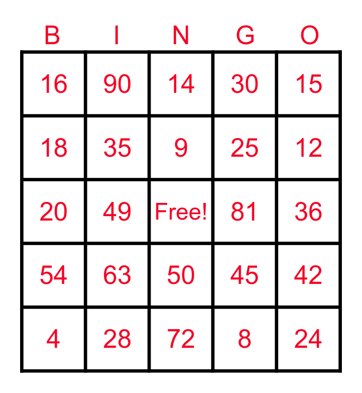 This bingo card has a free space and 30 words: 28, 32, 49, 64, 16, 14, 35, 50, 81, 72, 36, 24, 8, 10, 12, 27, 45, 54, 63, 15, 20, 48, 90, 25, 18, 30, 42, 4, 9 and 100.