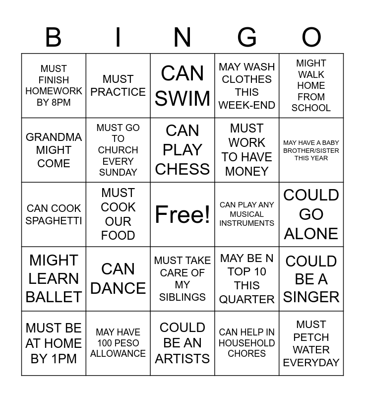 This bingo card has a free space and 24 words: CAN DANCE, MAY HAVE 100 PESO ALLOWANCE, CAN PLAY CHESS, MUST BE AT HOME BY 1PM, MIGHT WALK HOME FROM SCHOOL, MUST FINISH HOMEWORK BY 8PM, GRANDMA MIGHT COME, MUST PRACTICE, CAN PLAY ANY MUSICAL INSTRUMENTS, MUST TAKE CARE OF MY SIBLINGS, MUST WORK TO HAVE MONEY, CAN COOK SPAGHETTI, MAY BE N TOP 10 THIS QUARTER, COULD BE A SINGER, MUST GO TO CHURCH EVERY SUNDAY, CAN HELP IN HOUSEHOLD CHORES, COULD GO ALONE, CAN SWIM, MAY HAVE A BABY BROTHER/SISTER THIS YEAR, MUST COOK OUR FOOD, MUST PETCH WATER EVERYDAY, MIGHT LEARN BALLET, MAY WASH CLOTHES THIS WEEK-END and COULD BE AN ARTISTS.