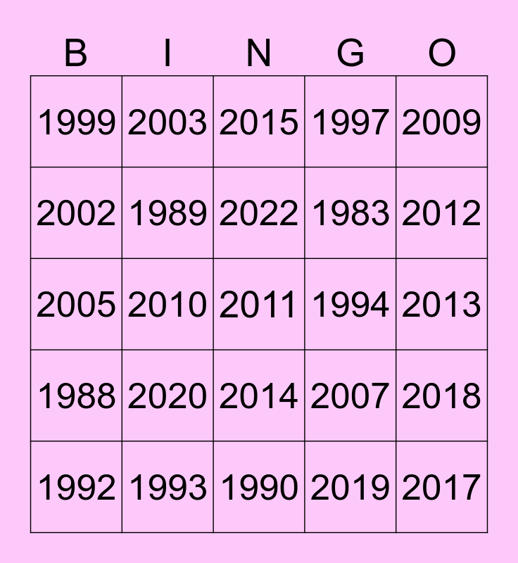 This bingo card has a free space and 42 words: 2023, 2022, 2021, 2020, 2019, 2018, 2017, 2016, 2015, 2014, 2013, 2012, 2010, 2009, 2008, 2007, 2006, 2005, 2004, 2003, 2002, 2001, 2000, 1999, 1981, 1982, 1983, 1984, 1985, 1986, 1987, 1988, 1989, 1990, 1991, 1992, 1993, 1994, 1995, 1996, 1997 and 1998.