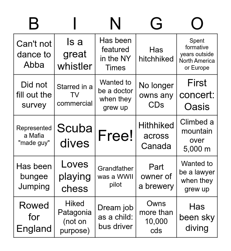 This bingo card has a free space and 40 words: Born with 37 teeth, Represented a Mafia "made guy", Has at least 2 cats, Starred in a TV commercial, Hiked Patagonia (not on purpose), Grandfather was a WWII pilot, Wanted to be a doctor when they grew up, Hiked a glacier and jumped out of a plane in the same day, Spent formative years outside North America or Europe, Has been bungee Jumping, Scuba dives, Has hitchhiked, Has been sky diving, Climbed a mountain over 5,000 m, Hithhiked across Canada, Loves playing chess, Has a large collection of books, Can't not dance to Abba, Has engaged in championship level martial arts, Has been featured in the NY Times, Wanted to be a lawyer when they grew up, Owns more than 10,000 cds, No longer owns any CDs, Did not fill out the survey, Has at least 2 passports, Comes into the office almost every day, Tried, but failed, to get tickets to the Eras tour, Reversed opinion about the grateful dead, Sat beside hugh grant on a plane, Can blow bubbles of their tounge, Picked up a snake next to their canoe, Rowed for England, Biked more than 16,000 miles, Part owner of a brewery, First concert: Oasis, Dream job as a child: bus driver, Attended the Eras tour., Attended an NYSNC Tour, Is a great whistler and Feature article in Playboy.