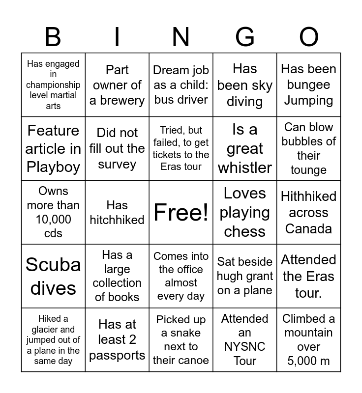 This bingo card has a free space and 40 words: Wanted to be a lawyer when they grew up, Owns more than 10,000 cds, No longer owns any CDs, Did not fill out the survey, Has at least 2 passports, Comes into the office almost every day, Tried, but failed, to get tickets to the Eras tour, Spent formative years outside North America or Europe, Has been bungee Jumping, Scuba dives, Has hitchhiked, Has been sky diving, Climbed a mountain over 5,000 m, Hithhiked across Canada, Loves playing chess, Has a large collection of books, Can't not dance to Abba, Has engaged in championship level martial arts, Has been featured in the NY Times, Dream job as a child: bus driver, Attended the Eras tour., Attended an NYSNC Tour, Is a great whistler, Feature article in Playboy, Born with 37 teeth, Represented a Mafia "made guy", Has at least 2 cats, Starred in a TV commercial, Hiked Patagonia (not on purpose), Grandfather was a WWII pilot, Wanted to be a doctor when they grew up, Hiked a glacier and jumped out of a plane in the same day, Reversed opinion about the grateful dead, Sat beside hugh grant on a plane, Can blow bubbles of their tounge, Picked up a snake next to their canoe, Rowed for England, Biked more than 16,000 miles, Part owner of a brewery and First concert: Oasis.