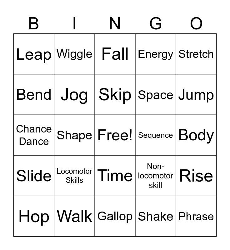 This bingo card has a free space and 24 words: Locomotor Skills, Walk, Skip, Hop, Stretch, Leap, Bend, Wiggle, Sequence, Time, Space, Chance Dance, Non-locomotor skill, Rise, Jog, Shake, Body, Fall, Jump, Shape, Phrase, Slide, Energy and Gallop.