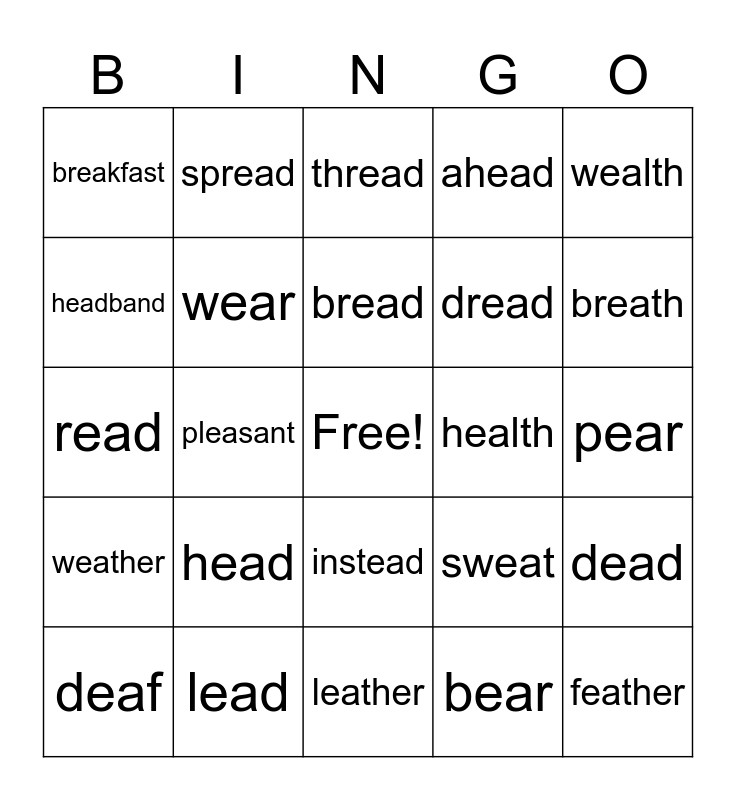 This bingo card has a free space and 24 words: head, lead, bread, deaf, wealth, breakfast, headband, spread, health, instead, dread, read, sweat, dead, wear, bear, pear, thread, breath, pleasant, feather, weather, ahead and leather.