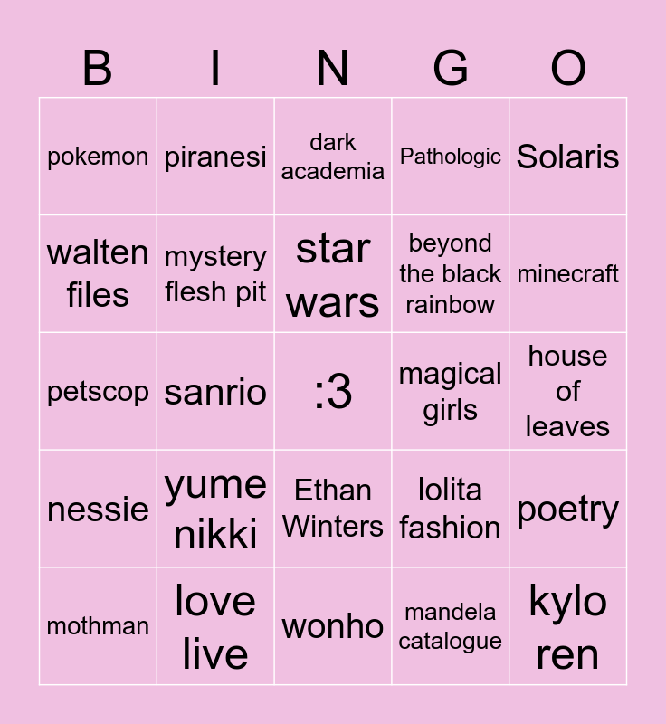 This bingo card has a free space and 24 words: yume nikki, love live, star wars, mothman, Solaris, pokemon, walten files, piranesi, magical girls, Ethan Winters, beyond the black rainbow, petscop, lolita fashion, poetry, mystery flesh pit, mandela catalogue, house of leaves, dark academia, minecraft, sanrio, kylo ren, nessie, Pathologic and wonho.