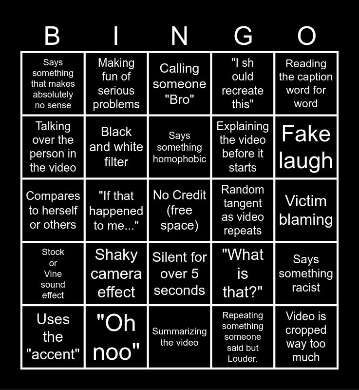 This bingo card has a free space and 29 words: Uses the "accent", Freebooting a freebooted video, "If that happened to me...", Random graphic that adds nothing, Says something that makes absolutely no sense, Calling someone "Bro", Black and white filter, Shaky camera effect, Random tangent as video repeats, "Oh noo", Victim blaming, Video is cropped way too much, Summarizing the video, Repeating something someone said but Louder., Fake laugh, "Gasp", Silent for over 5 seconds, Stock or Vine sound effect, Reading the caption word for word, Compares to herself or others, "What is that?", Makes fun of the tiktok for no reason, Explaining the video before it starts, Talking over the person in the video, "I should recreate this", Making fun of serious problems, Says something racist, Says something homophobic and A bingo is repeated more than once.