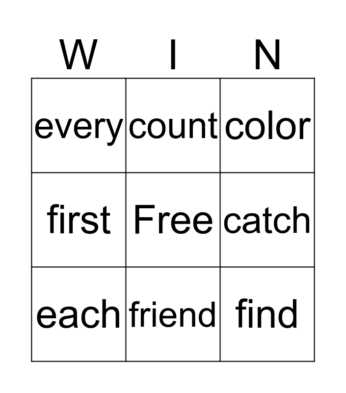 This bingo card has a free space and 8 words: catch, color, count, each, every, find, first and friend.
