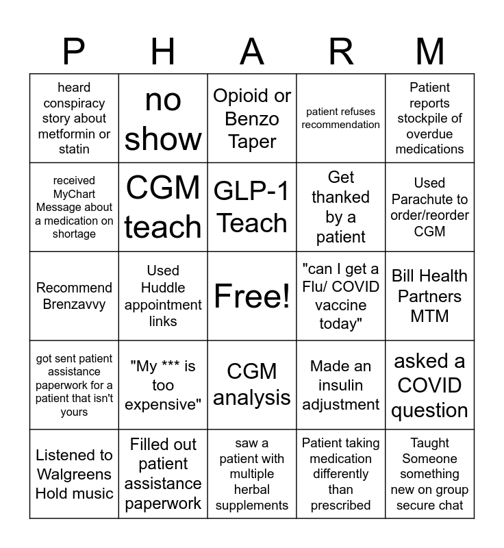 This bingo card has a free space and 24 words: "My *** is too expensive", Filled out patient assistance paperwork, GLP-1 Teach, Listened to Walgreens Hold music, Patient reports stockpile of overdue medications, heard conspiracy story about metformin or statin, received MyChart Message about a medication on shortage, no show, "can I get a Flu/ COVID vaccine today", CGM analysis, Get thanked by a patient, Recommend Brenzavvy, Made an insulin adjustment, asked a COVID question, CGM teach, Patient taking medication differently than prescribed, Bill Health Partners MTM, Opioid or Benzo Taper, Used Parachute to order/reorder CGM, Used Huddle appointment links, Taught Someone something new on group secure chat, got sent patient assistance paperwork for a patient that isn't yours, patient refuses recommendation and saw a patient with multiple herbal supplements.