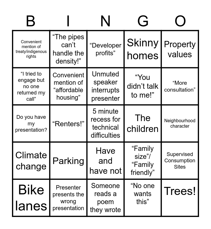 This bingo card has a free space and 31 words: Someone reads a poem they wrote, Crying, “Renters!”, Council is accused of settler colonialism, Convenient mention of treaty/indigenous rights, “Developer profits”, Convenient mention of “affordable housing”, “Family size”/ “Family friendly”, The children, “No one wants this”, Neighbourhood character, Trees!, Someone performs a song they wrote, 15 minute cities, “More consultation”, A child is paraded in to speak about zoning, Supervised Consumption Sites, Parking, Climate change, Have and have not, Property values, Tax grab!, Bike lanes, “The pipes can’t handle the density!”, “You didn’t talk to me!”, “I tried to engage but no one returned my call”, Skinny homes, Do you have my presentation?, Presenter presents the wrong presentation, Unmuted speaker interrupts presenter and “Can you hear me?”.