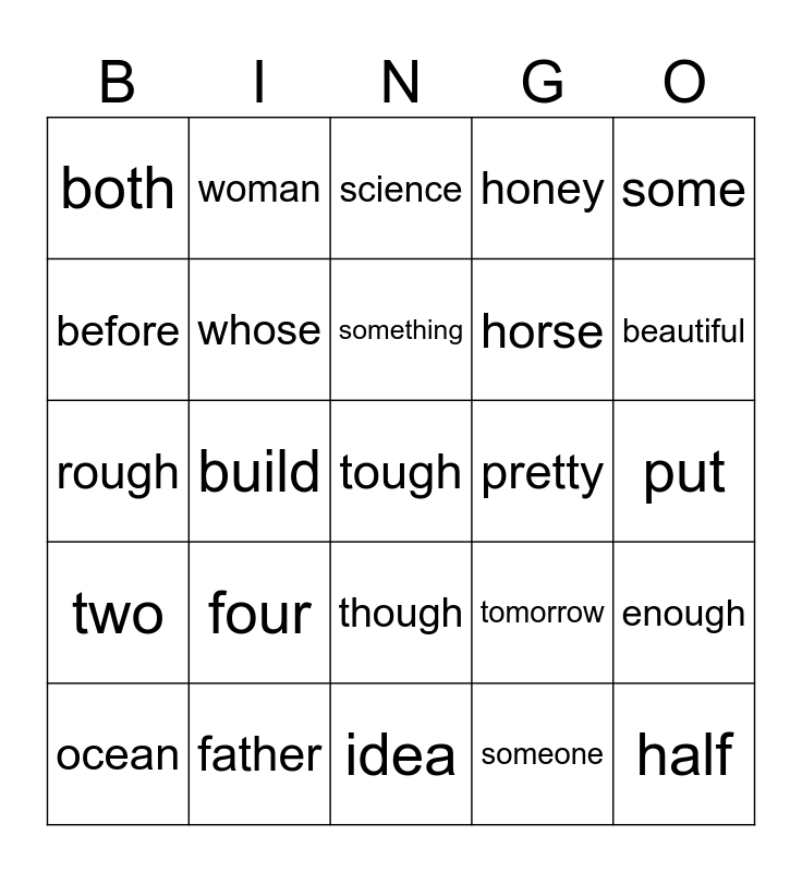 This bingo card has a free space and 26 words: though, someone, something, father, some, both, before, woman, put, tomorrow, horse, rough, enough, ocean, build, money, honey, two, science, half, beautiful, idea, pretty, four, whose and laugh.
