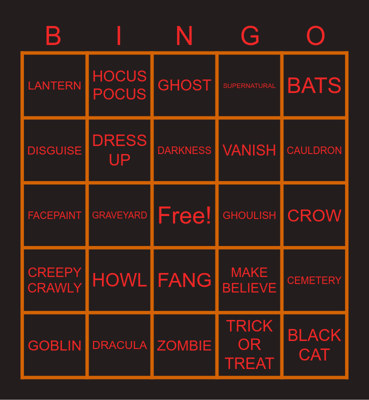 This bingo card has a free space and 49 words: SKELETON, BLACK CAT, OCTOBER, ZOMBIE, HOWL, WITCHES, HOCUS POCUS, CANDY CORN, DISGUISE, PHANTOM, DRESS UP, SUPERNATURAL, CEMETERY, MAKE BELIEVE, WARLOCK, VAMPIRE, DARKNESS, GHOULISH, FRIIGHTFUL, BATS, GRAVEYARD, TRICK OR TREAT, LANTERN, VANISH, TOMBSTONE, CAULDRON, GOBLIN, DREADFUL, FANG, CREEPY CRAWLY, JACK O LANTERN, SPELLS, SKULL, MAGIC WAND, DRACULA, WEREWOLF, SPIDER WEB, HAUNTED HOUSE, CROW, MASK, BOGEYMAN, COFFIN, CLOAK, EYEBALLS, FACEPAINT, GHOST, NIGHTMARE, SCREAM and TARANTULA.