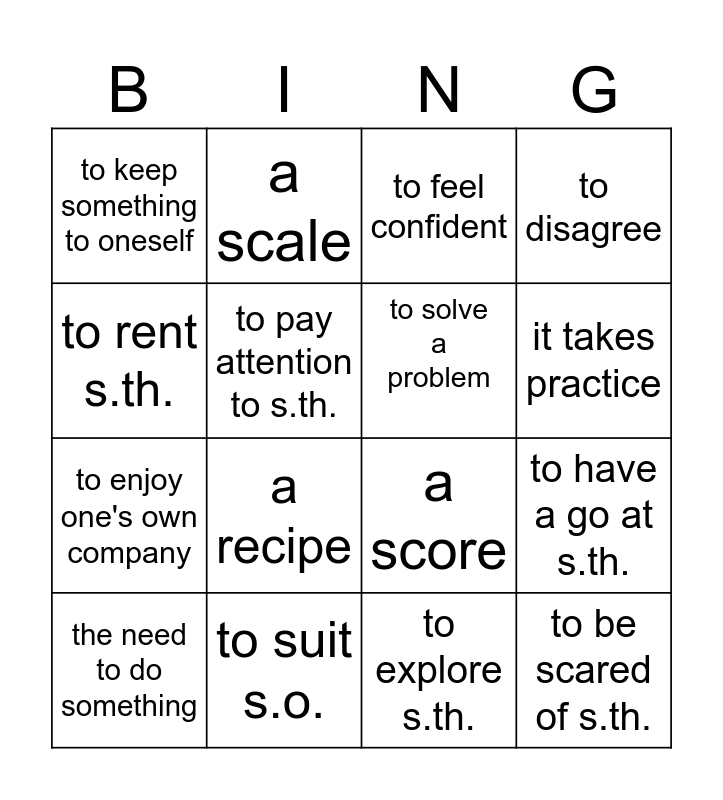 This bingo card has 16 words: to suit s.o., to have a go at s.th., to feel confident, to keep something to oneself, to enjoy one's own company, a scale, a score, to explore s.th., to rent s.th., to pay attention to s.th., the need to do something, to disagree, a recipe, it takes practice, to solve a problem and to be scared of s.th..