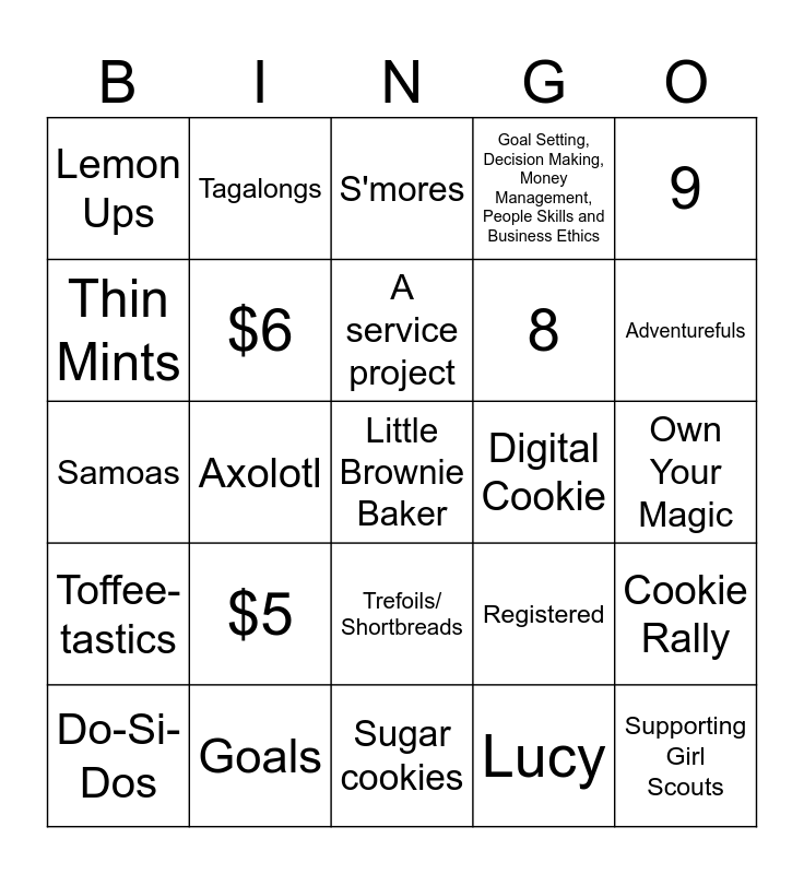 This bingo card has a free space and 24 words: $5, Goals, A service project, Do-Si-Dos, 9, Lemon Ups, Thin Mints, Tagalongs, Digital Cookie, Trefoils/ Shortbreads, 8, Samoas, Registered, Cookie Rally, $6, Lucy, Own Your Magic, S'mores, Adventurefuls, Axolotl, Supporting Girl Scouts, Toffee-tastics, Goal Setting, Decision Making, Money Management, People Skills and Business Ethics and Sugar cookies.