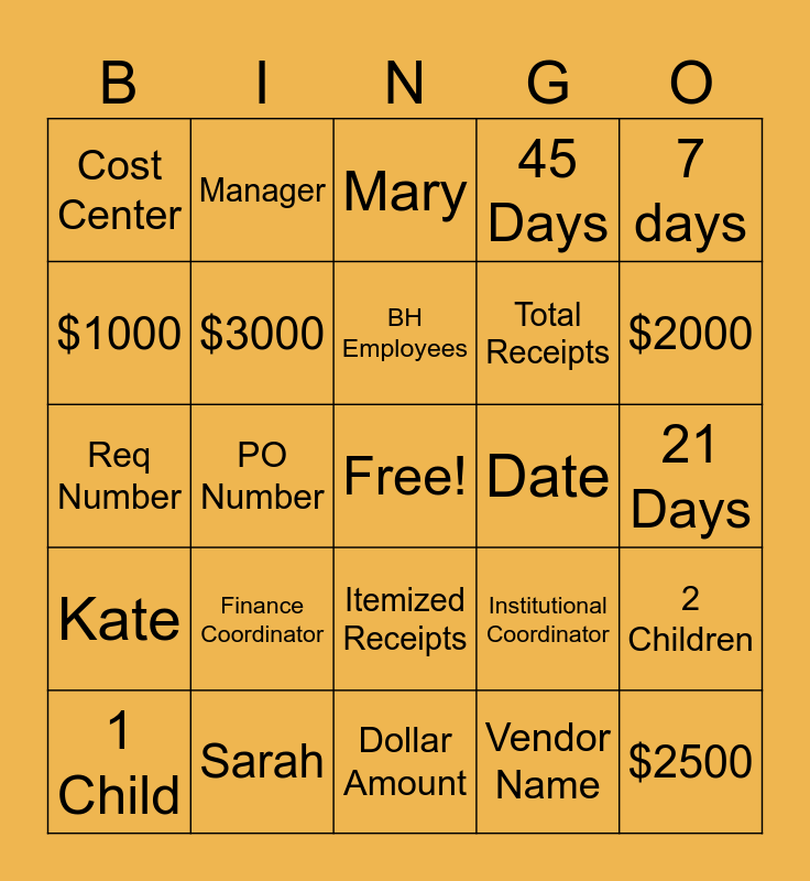 This bingo card has a free space and 24 words: Finance Coordinator, Sarah, BH Employees, 1 Child, 7 days, Cost Center, $1000, Manager, Date, Itemized Receipts, Total Receipts, Req Number, Institutional Coordinator, 2 Children, $3000, Vendor Name, 21 Days, Mary, $2000, PO Number, $2500, Kate, 45 Days and Dollar Amount.