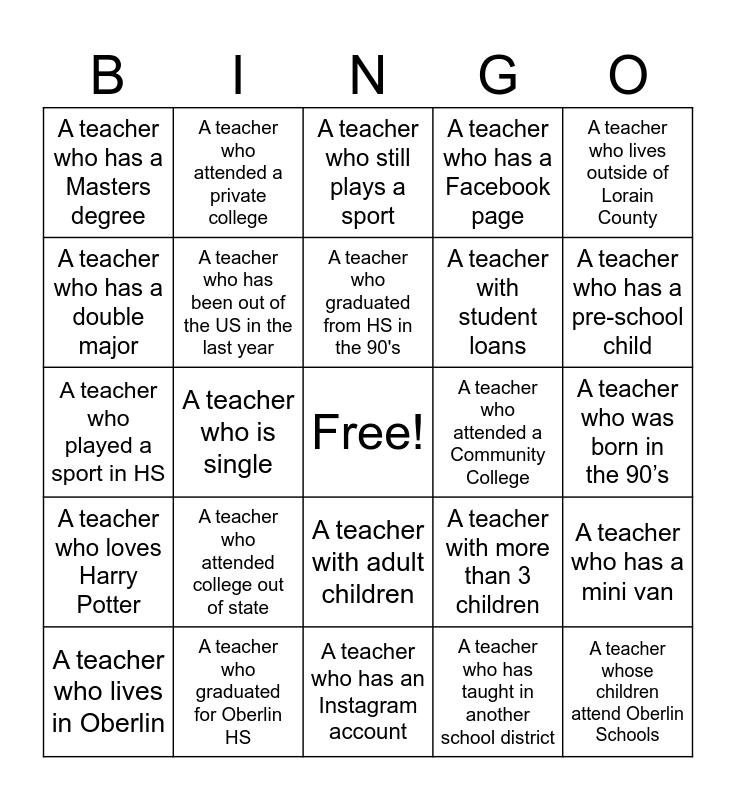 This bingo card has a free space and 24 words: A teacher who attended college out of state, A teacher who graduated for Oberlin HS, A teacher who graduated from HS in the 90's, A teacher who lives in Oberlin, A teacher who lives outside of Lorain County, A teacher who has a Masters degree, A teacher who has a double major, A teacher who attended a private college, A teacher who attended a Community College, A teacher with adult children, A teacher with student loans, A teacher who played a sport in HS, A teacher with more than 3 children, A teacher who has a mini van, A teacher who has been out of the US in the last year, A teacher who has taught in another school district, A teacher who was born in the 90’s, A teacher who still plays a sport, A teacher who has a pre-school child, A teacher who is single, A teacher whose children attend Oberlin Schools, A teacher who loves Harry Potter, A teacher who has a Facebook page and A teacher who has an Instagram account.