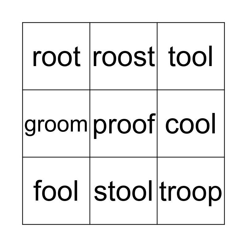 This bingo card has 13 words: soon, noon, fool, roost, groom, proof, troop, wool, stool, root, cool, tool and hoop.