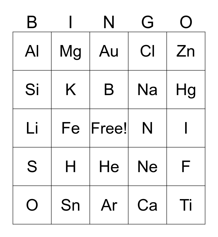 This bingo card has a free space and 24 words: H, Sn, B, O, Zn, Al, Si, Mg, N, He, Na, Li, Ne, F, K, Ca, I, Au, Hg, Fe, Ti, S, Cl and Ar.