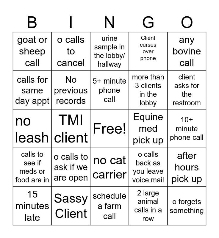 This bingo card has a free space and 24 words: o calls to ask if we are open, Sassy Client, 5+ minute phone call, 15 minutes late, any bovine call, goat or sheep call, calls for same day appt, o calls to cancel, Equine med pick up, no cat carrier, more than 3 clients in the lobby, no leash, o calls back as you leave voice mail, after hours pick up, No previous records, 2 large animal calls in a row, 10+ minute phone call, urine sample in the lobby/ hallway, client asks for the restroom, TMI client, o forgets something, calls to see if meds or food are in, Client curses over phone and schedule a farm call.