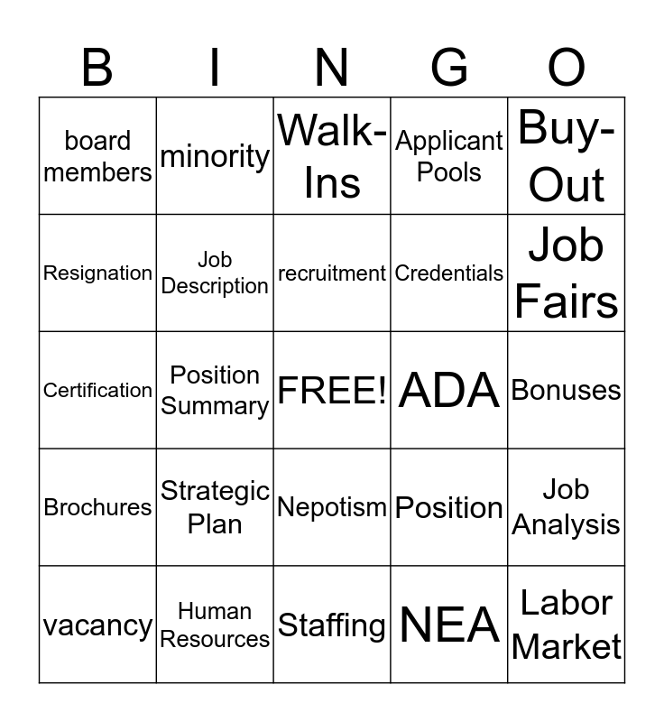 This bingo card has a free space and 24 words: Strategic Plan, Human Resources, recruitment, vacancy, Buy-Out, board members, Resignation, minority, ADA, Nepotism, Credentials, Certification, Position, Job Analysis, Job Description, NEA, Bonuses, Walk-Ins, Job Fairs, Position Summary, Labor Market, Brochures, Applicant Pools and Staffing.