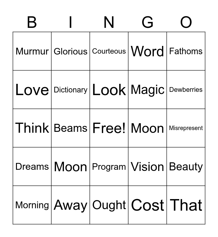 This bingo card has a free space and 35 words: Our, Free, English, Dictionary, Program, Word, Love, Where, Look, Know, Think, Fathoms, Allow, Light, Murmur, Moon, Cost, Beams, Dreams, That, Vision, Morning, Beauty, Away, Courteous, Dewberries, Humble, Glow, Magic, Misrepresent, Truth, Ought, Moon, Glorious and deprive.