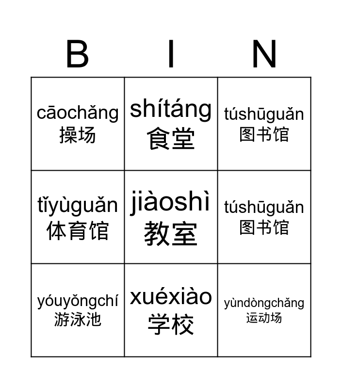 This bingo card has a free space and 10 words: xuéxiào 学校, túshūguǎn 图书馆, cāochǎng 操场, yùndòngchǎng 运动场, tǐyùguǎn 体育馆, yóuyǒngchí 游泳池, shítáng 食堂, lǐtáng 礼堂, túshūguǎn 图书馆 and jiàoshì 教室.