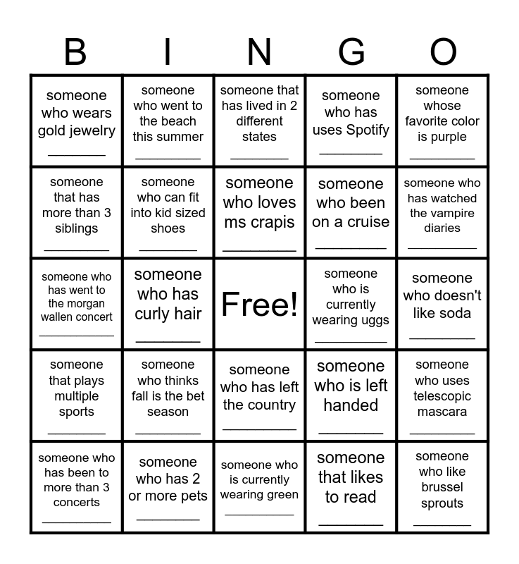 This bingo card has a free space and 30 words: someone who has 2 or more pets ________, someone who is a norris nuts fan ________, someone who has curly hair _______, someone who is taller than 5'8 ________, someone who wears gold jewelry _______, someone that has lived in 2 different states ________, someone who can fit into kid sized shoes ________, someone who has left the country _________, someone who is currently wearing uggs __________, someone who is currently wearing green __________, someone who doesn't like soda ________, someone who like brussel sprouts ________, someone that likes to read _______, someone with a pool _______, someone who has watched the vampire diaries __________, someone who like mint chocolate chip flavored ice cream __________, someone who is left handed _______, someone that plays multiple sports ________, someone who thinks fall is the bet season _________, someone whose favorite color is purple _________, someone who has went to the morgan wallen concert ____________, someone who likes taylor swift ________, someone who went to the beach this summer _________, someone who been on a cruise ________, someone that has more than 3 siblings _________, someone who has uses Spotify ________, someone who uses telescopic mascara _________, someone who has been to more than 3 concerts __________, someone who loves ms crapis ________ and someone is has taken psych ________.