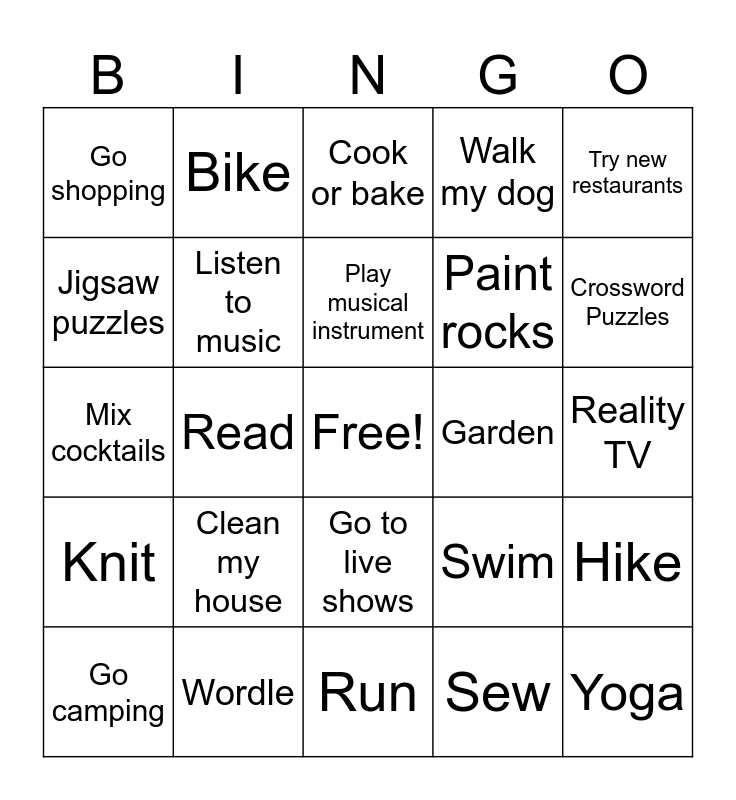 This bingo card has a free space and 27 words: Swim, Dance, Paint rocks, Run, Jigsaw puzzles, Cook or bake, Bike, Knit, Garden, Hike, Mix cocktails, Walk my dog, Go camping, Wordle, Crossword Puzzles, Play Pickleball, Listen to music, Play musical instrument, Clean my house, Go shopping, Reality TV, Sew, Read, Yoga, Go to live shows, Try new restaurants and Paint my nails.