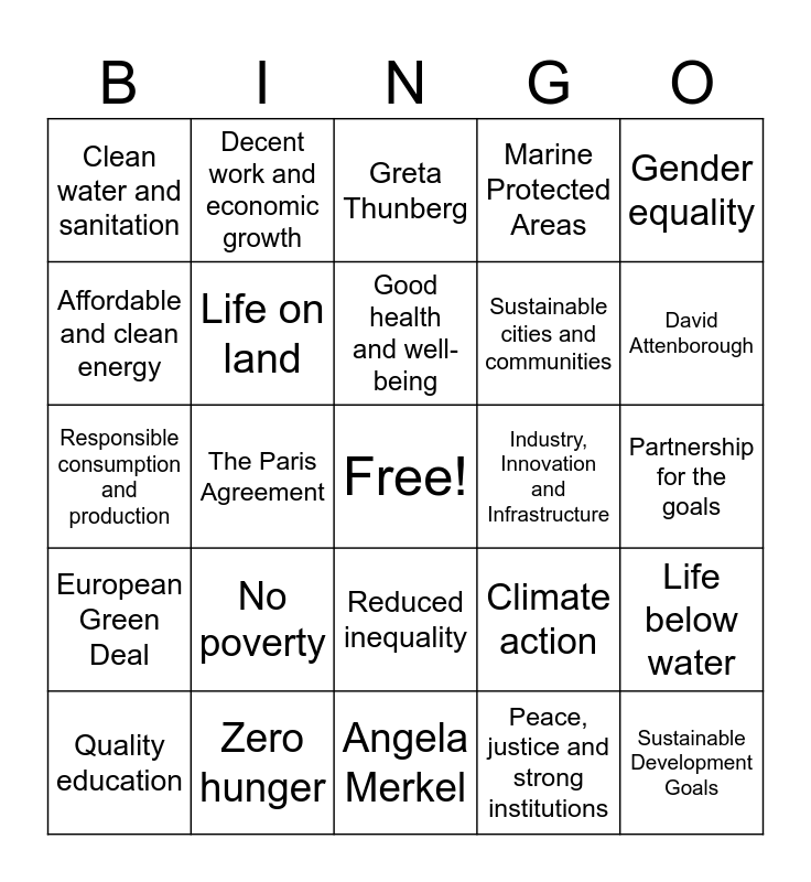 This bingo card has a free space and 24 words: No poverty, Zero hunger, Good health and well-being, Quality education, Gender equality, Clean water and sanitation, Affordable and clean energy, Decent work and economic growth, Industry, Innovation and Infrastructure, Reduced inequality, Sustainable cities and communities, Responsible consumption and production, Climate action, Life below water, Life on land, Peace, justice and strong institutions, Partnership for the goals, Greta Thunberg, David Attenborough, The Paris Agreement, Sustainable Development Goals, European Green Deal, Marine Protected Areas and Angela Merkel.
