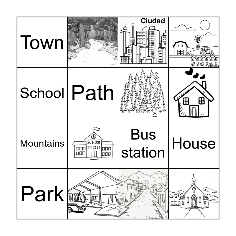 This bingo card has 11 images and 11 words: Ranch, Church, Path, Town, Bus station, Mountains, Forest, City, House, Park and School.