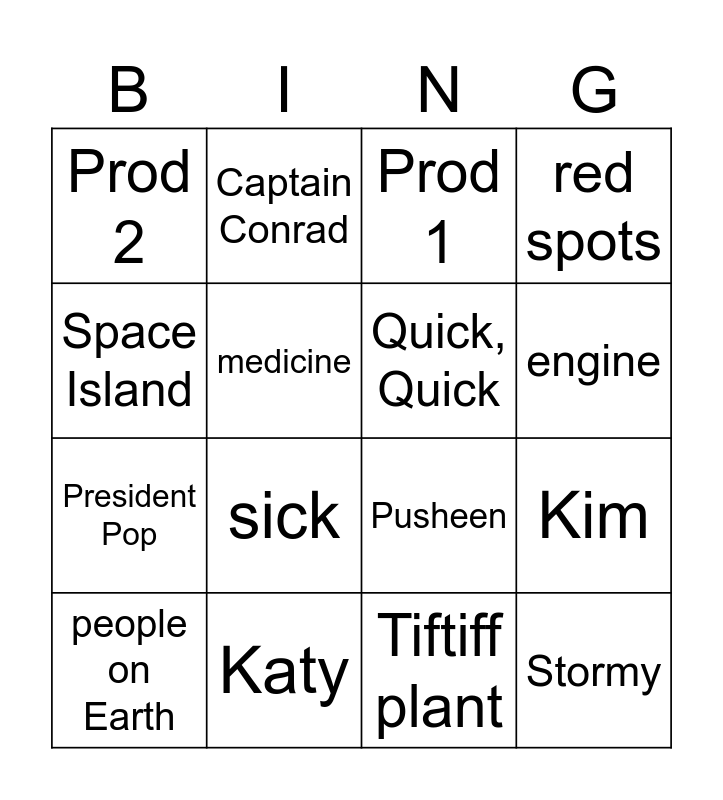 This bingo card has 16 words: Katy, Kim, Prod 1, Prod 2, President Pop, Captain Conrad, Pusheen, Tiftiff plant, Space Island, medicine, people on Earth, red spots, sick, engine, Quick, Quick and Stormy.