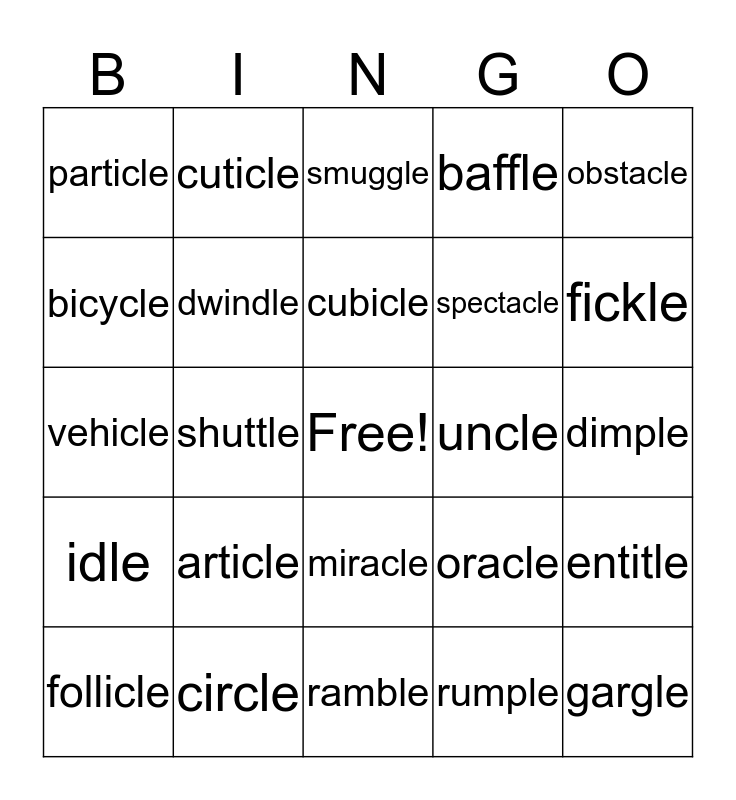 This bingo card has a free space and 24 words: article, circle, cubicle, follicle, obstacle, particle, bicycle, cuticle, uncle, miracle, spectacle, vehicle, oracle, entitle, dwindle, rumple, dimple, smuggle, fickle, shuttle, gargle, idle, baffle and ramble.
