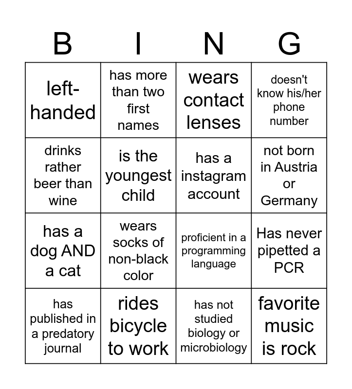 This bingo card has 16 words: rides bicycle to work, Has never pipetted a PCR, wears contact lenses, left-handed, has a dog AND a cat, has more than two first names, proficient in a programming language, has not studied biology or microbiology, drinks rather beer than wine, is the youngest child, has published in a predatory journal, doesn't know his/her phone number, wears socks of non-black color, not born in Austria or Germany, has a instagram account and favorite music is rock.