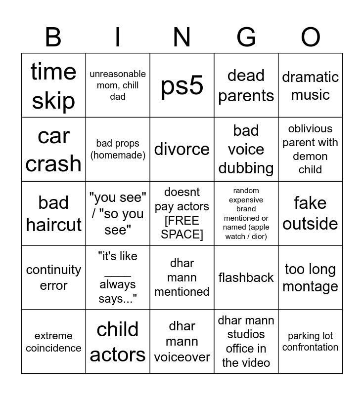 This bingo card has a free space and 31 words: dhar mann voiceover, error, "you see" / "so you see", merch in video, time skip, ps5, bad props (homemade), flashback, random expensive brand mentioned or named (apple watch / dior), dhar mann studios office in the video, fake outside, parking lot confrontation, spaghetti, creep behavior, oblivious parent with demon child, kids with ipad, too long montage, "it's like ____ always says...", continuity error, dhar mann mentioned, dramatic music, someone fired over something small, extreme coincidence, unreasonable mom, chill dad, bad voice dubbing, car crash, dead parents, bad haircut, child actors, divorce and unrealistic bullying.