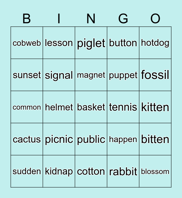 This bingo card has a free space and 24 words: picnic, kidnap, magnet, sudden, hotdog, cobweb, sunset, lesson, tennis, public, puppet, common, happen, bitten, signal, rabbit, kitten, piglet, fossil, helmet, blossom, cactus, button and cotton.