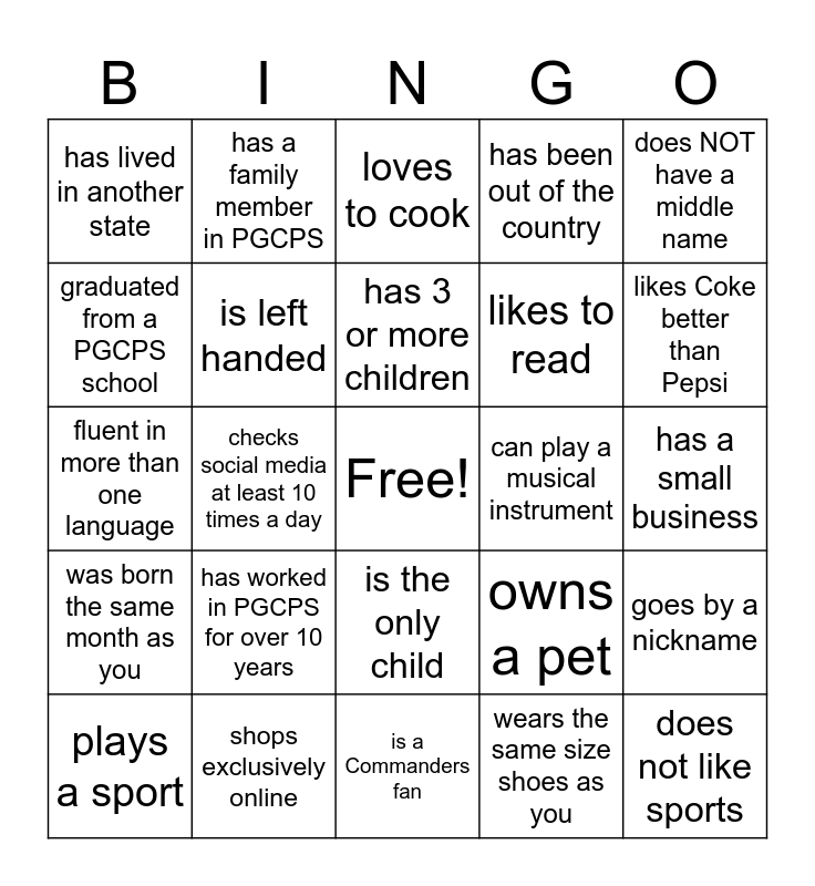 This bingo card has a free space and 25 words: has worked in PGCPS for over 10 years, is a Commanders fan, has 3 or more children, plays a sport, does NOT have a middle name, has lived in another state, graduated from a PGCPS school, has a family member in PGCPS, can play a musical instrument, is the only child, likes to read, fluent in more than one language, owns a pet, goes by a nickname, is left handed, has a birthday in October, has a small business, loves to cook, likes Coke better than Pepsi, checks social media at least 10 times a day, does not like sports, shops exclusively online, was born the same month as you, has been out of the country and wears the same size shoes as you.