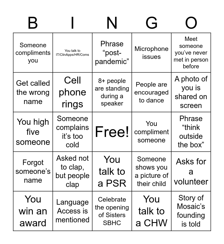 This bingo card has a free space and 38 words: Word “Belonging” is mentioned, Phrase “Unique opportunity”, Someone spills coffee, Cell phone rings, Asks for a volunteer, Asked not to clap, but people clap, 8+ people are standing during a speaker, Phrase “Let’s take a stretch break”, Meet someone you’ve never met in person before, People are encouraged to dance, Someone complains it’s too cold, Microphone issues, Story of Mosaic’s founding is told, Phrase “think outside the box”, Get called the wrong name, Forgot someone’s name, Asked to “reflect on …”, Phrase “post-pandemic”, Tabletop whispering that is distracting, You compliment someone, Someone compliments you, Language Access is mentioned, A photo of you is shared on screen, You win an award, You carpooled to the meeting with 3+ people, Celebrate the opening of Sisters SBHC, You are wearing mosaic gear, You take a walk during lunch, Patient story is shared, A provider is on a aptop working, You talk to a BHC, You talk to a PSR, You talk to a CHW, You talk to IT/ClinApps/HR/Coms, Someone shows you a picture of their pet, Someone shows you a picture of their child, You high five someone and You sit at a table with people you don’t see every day.