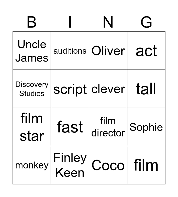 This bingo card has 16 words: Finley Keen, Sophie, Oliver, Uncle James, film star, auditions, film director, Coco, Discovery Studios, script, monkey, act, fast, tall, clever and film.