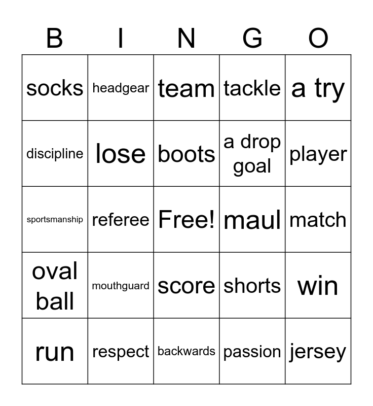 This bingo card has a free space and 24 words: mouthguard, respect, boots, run, a try, socks, discipline, headgear, maul, score, a drop goal, sportsmanship, shorts, win, lose, passion, match, team, player, referee, jersey, oval ball, tackle and backwards.