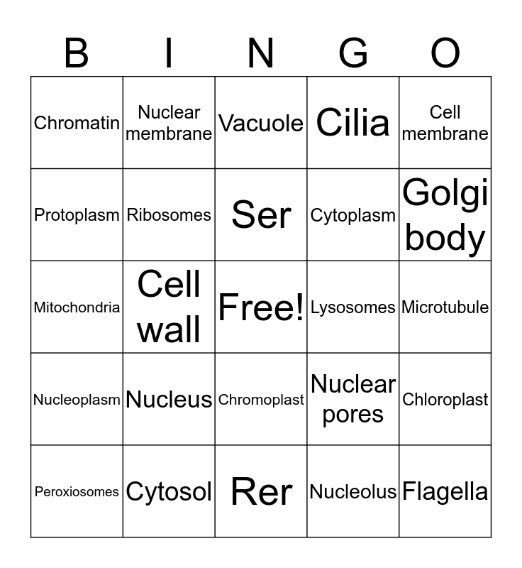 This bingo card has a free space and 24 words: Nucleus, Cytosol, Ser, Peroxiosomes, Cell membrane, Chromatin, Protoplasm, Nuclear membrane, Lysosomes, Chromoplast, Cytoplasm, Mitochondria, Nuclear pores, Chloroplast, Ribosomes, Nucleolus, Microtubule, Vacuole, Golgi body, Cell wall, Flagella, Nucleoplasm, Cilia and Rer.