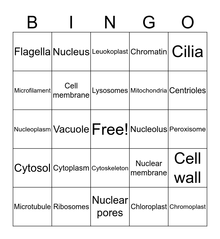 This bingo card has a free space and 24 words: Cytoplasm, Ribosomes, Lysosomes, Microtubule, Cilia, Flagella, Microfilament, Nucleus, Nucleolus, Cytoskeleton, Mitochondria, Nucleoplasm, Nuclear membrane, Cell wall, Cell membrane, Chloroplast, Peroxisome, Leuokoplast, Centrioles, Vacuole, Chromoplast, Cytosol, Chromatin and Nuclear pores.