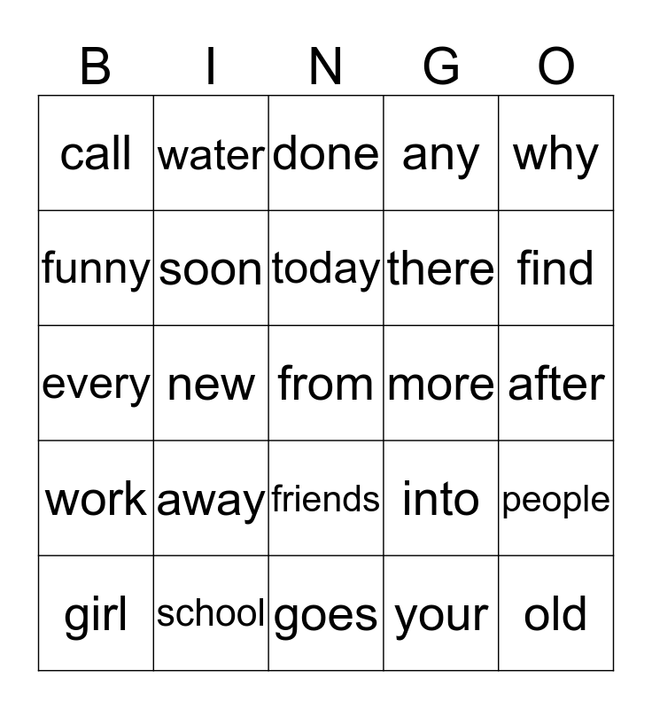 This bingo card has a free space and 24 words: away, school, today, girl, why, call, funny, water, more, friends, there, every, into, people, soon, your, after, done, find, new, old, work, any and goes.
