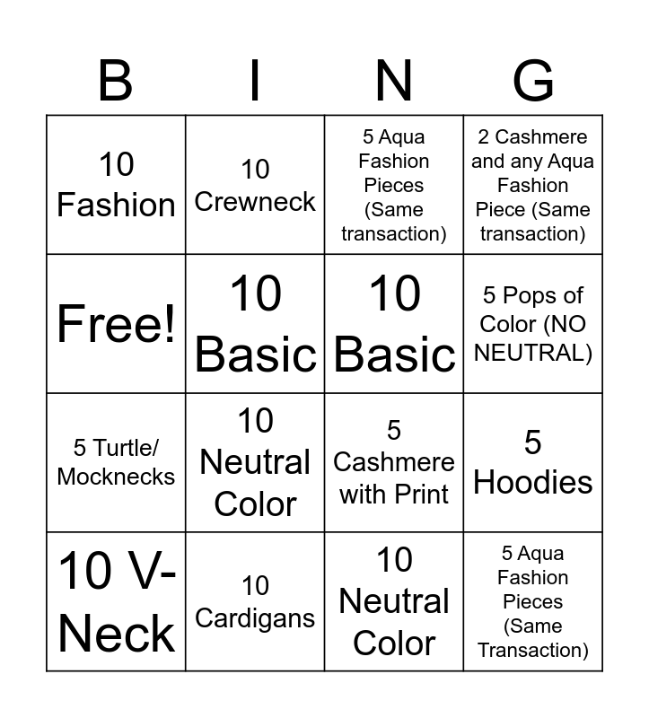 This bingo card has 16 words: 10 Cardigans, 5 Hoodies, 5 Aqua Fashion Pieces (Same transaction), 10 Fashion, 5 Turtle/ Mocknecks, 10 Crewneck, 5 Cashmere with Print, 10 Neutral Color, Free!, 10 Basic, 10 V-Neck, 2 Cashmere and any Aqua Fashion Piece (Same transaction), 10 Neutral Color, 5 Pops of Color (NO NEUTRAL), 10 Basic and 5 Aqua Fashion Pieces (Same Transaction).